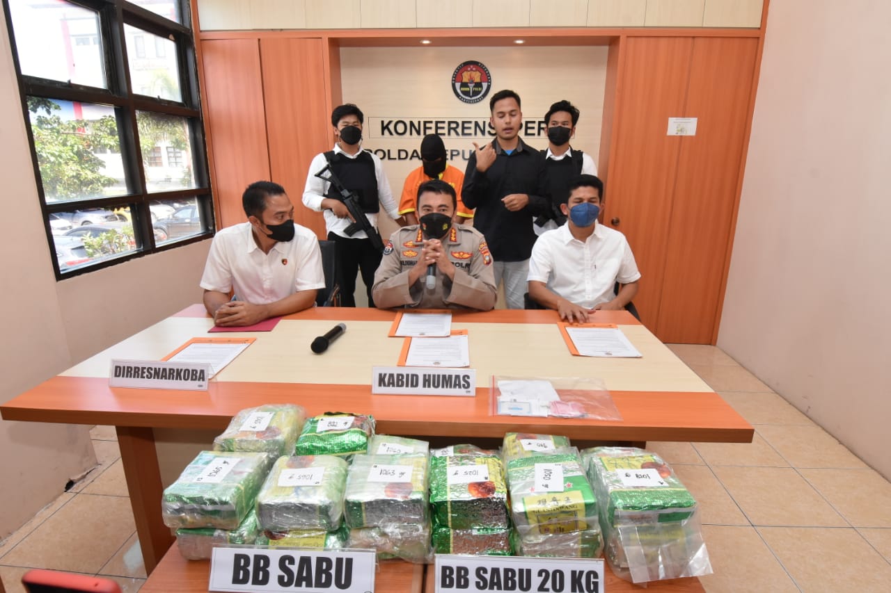 KABARTIGA, BATAM – Tersangka Inisial ZL Alias Z seorang laki-laki 39 tahun berhasil diamankan oleh Dit Resnarkoba Polda Kepri dikarenakan telah membawa Narkotika jenis sabu sebanyak 20 bungkus teh cina merek Gua Yin Wang dengan berat 20.890 gram atau hampir 21 Kg, hal tersebut disampaikan oleh Kabid Humas Polda Kepri Kombes Pol Harry Goldenhardt S., S.IK., M.Si didampingi oleh Dir Resnarkoba Polda Kepri Kombes Pol Ahmad David, S.Ik dan Wadir Resnarkoba Polda Kepri Dasmin Ginting, S.Ik, Pada saat Konferensi Pers di Media Center Bid Humas Polda Kepri, Rabu (30/3/2022).