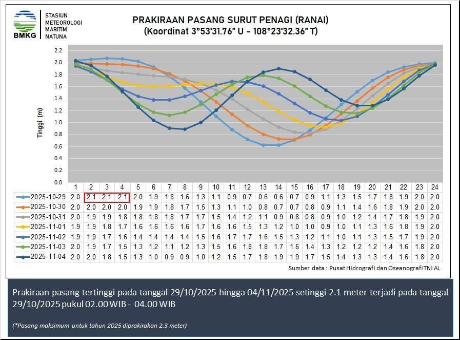 Dalam informasi tinggi gelombang Nomor: B/ME.01.02/PDGT/29/NTN/X/2025, disebutkan bahwa kondisi cuaca tersebut berlaku sejak 30 Oktober 2025 pukul 07.00 WIB hingga 2 November 2025 pukul 07.00 WIB. Informasi ini disampaikan oleh Prakirawan BMKG Stasiun Meteorologi Maritim Natuna, Prabu Aditya, pada 29 Oktober 2025.