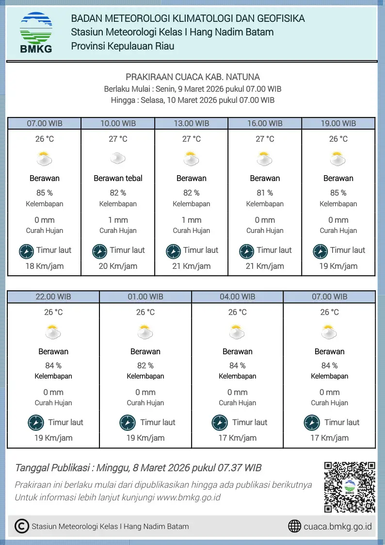 KABARTIGA.ID, Natuna – Badan Meteorologi, Klimatologi, dan Geofisika (BMKG) Stasiun Meteorologi Maritim Kelas III Natuna kembali mengeluarkan informasi prakiraan tinggi gelombang untuk wilayah perairan Natuna dan sekitarnya pada periode 9 hingga 12 Maret 2026.