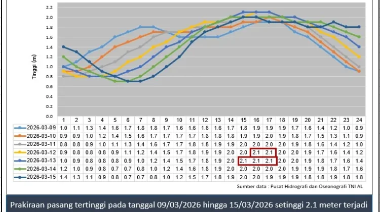 Informasi tersebut tertuang dalam rilis tinggi gelombang Nomor: B/ME.01.02/PDGT/08/NTN/III/2026 yang berlaku mulai 9 Maret 2026 pukul 07.00 WIB hingga 12 Maret 2026 pukul 07.00 WIB.